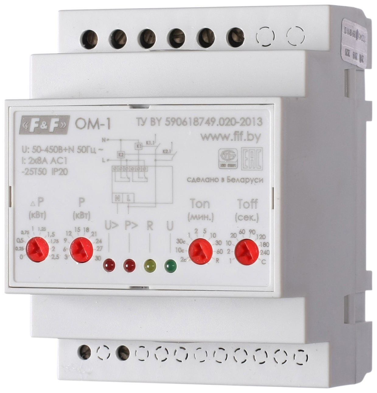 Максимальный ток контактов реле (AC1) | 2х8 А |