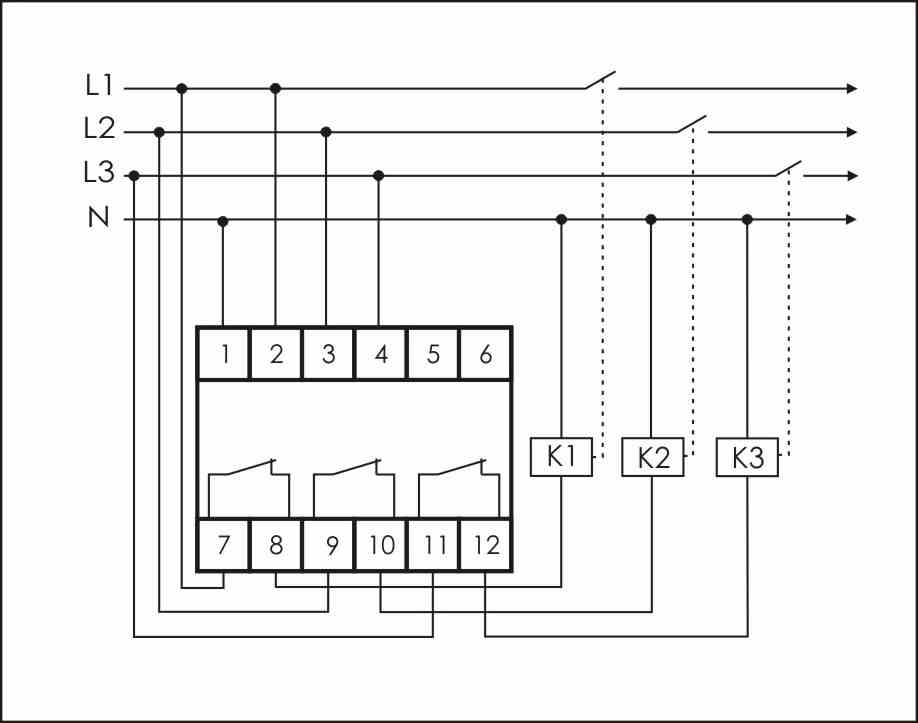 Принцип работыПри установке потенциометра в положение «OFF» отключение реле по соответствующему порогу производится не будет. Реле имеет 3 независимых выхода для каждой фазы.