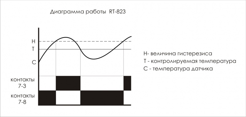 Регулятор температуры RT-823 предназначен для контроля и поддержания заданного температурного режима путём включения-выключения нагревательной (охлаждающей) установки по сигналам выносного датчика температуры: в помещениях, овощехранилищах, системах водяного отопления и т. п., а также в качестве комплектующего изделия в устройствах автоматики.
