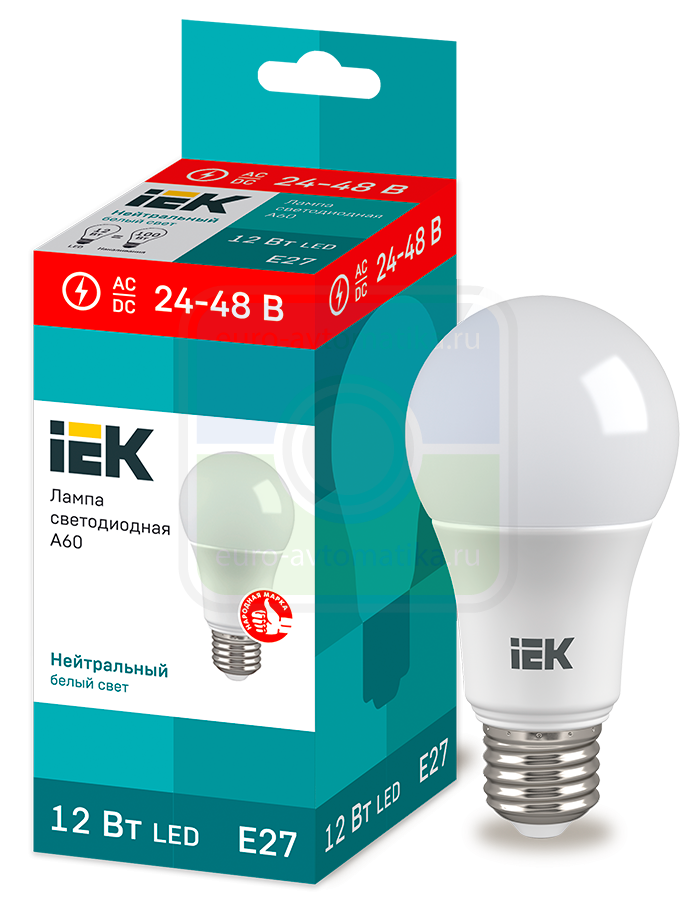 Лампа LED A60 груша 12Вт 24-48В 4000К E27 IEK применяется в сетях 12-24 или 24-48В постоянного и переменного тока, в помещениях с повышенной влажностью, а также низковольтных системах резервного освещения.