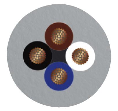 Бухта кабеля, полиуретан, не содержащий галогена, серого цвета, повышенной гибкости, стойкий к брызгам расплавленного металла, 4-жильный кабель, цвета жил: коричневый / белый / синий / черный, длина кабеля: 100 м