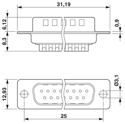 Контактная вставка D-SUB, размер 1, с 9 контактами для сигнальных цепей, штыревые контакты, с лепестком для пайки, прямые, для крепления предусмотрены отверстия 3 мм, для монтажных рам и сальниковых корпусов VS-09-...