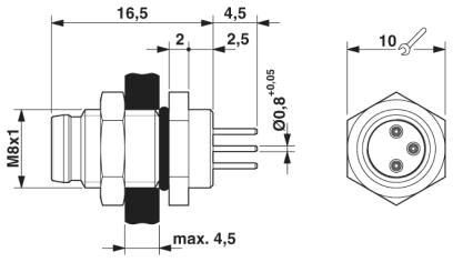 Встраиваемая штыревая часть разъема для датчика / исполнительного устройства, штыревые контакты, 3-полюсная, M8, монтаж с задней части стенки / винтовой монтаж с резьбой M8, с прямыми выводами под пайку