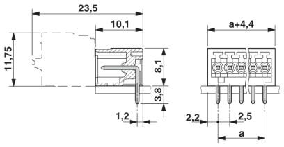 Корпусная часть для печатных плат, номинальный ток: 4 A, расчетное напряжение (III/2): 160 В, полюсов: 10, размер шага: 2,5 мм, цвет: зеленый, поверхность контакта: олово, монтаж: Пайка волной припоя