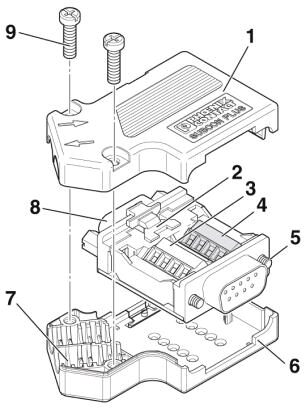 Штекер D-SUB, 9-контактное гнездо, два ввода кабеля под углом 35° в двух рядах клемм, шинная система: CAN, CANopen, SafetyBus-P до 1 мбит/с, подсоединение нагрузочного резистора через передвижной выключатель, расположение выводов: 2,3,7,9; винтовые клеммы