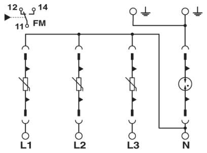 Универсальный вставной молниеотвод / УЗИП на базе варисторов для 3-фазных цепей электропитания с отдельным проводником N и PE (5-проводная система: L1, L2, L3, N, PE), для классов молниезащиты III и IV, с контактом для дистанционной передачи сигнала.