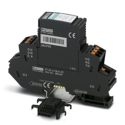 Защита от перенапряжений, включает в себя защитный штекер и базовый элемент, со встроенной многоступенчатой индикацией состояния на модуле для трех сигнальных проводников с общим опорным потенциалом. Непрямое заземление через газовый разрядник. Для высокочастотных приложений и телекоммуникационных интерфейсов без напряжения питания (до 90 Мбит/с).