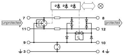 Защита от перенапряжений, включает в себя защитный штекер и базовый элемент, со встроенной многоступенчатой индикацией состояния на модуле для трех сигнальных проводников с общим опорным потенциалом. Для высокочастотных приложений и телекоммуникационных интерфейсов без напряжения питания (до 90 Мбит/с).