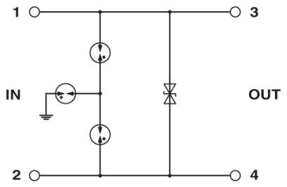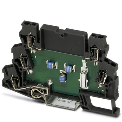 Двухъярусная электротехническая клемма с двухступенчатой защитой от импульсных перенапряжений для одной двухпроводной сигнальной цепи, чувствительной к общему сопротивлению, раздельное подключение PE, номинальное напряжение: 24 В постоянного тока.