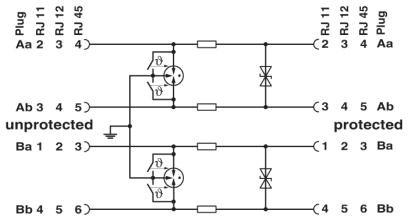 Промежуточный штекер с устройством защиты от импульсных перенапряжений, для двух телекоммуникационных интерфейсов SHDSL (Ports). Разъем: RJ45 (RJ12/RJ11) и вставная винтовая клемма (COMBICON). Возможность установки на несущую рейку.