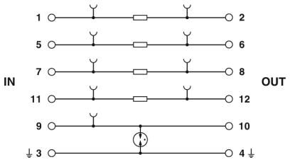 Основной элемент для защитного штекера РТ, со схемой защиты 4-проводной сигнальной цепи, газонаполненный разрядник между клеммами 3-4 (GND) и 9-10, для монтажа на NS 35/7,5 и NS 35/15, ширина корпуса: 17,5 мм