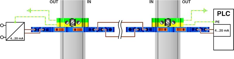 Клеммные блоки с пружинными зажимами, со встроенной трехступенчатой защитой от импульсных перенапряжений сигнальной цепи Ex i без потенциала земли, раздельное подключение PE, номинальное напряжение: 24 В DC, монтаж на рейку NS 35