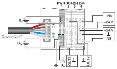 Шинный соединитель со встроенными вводами-выводами предназначен для применения в сети DeviceNet™ и является связующим звеном с системой ввода-вывода Inline.