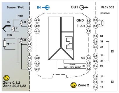 Программируемый измерительный преобразователь температуры с аналоговым выходом и 3 реле предельного значения, искробезопасные сигнальные входы, резистивный термометр с 2-, 3- или 4-проводной схемой подключения, термоэлементы, гальваническая развязка, широкий диапазон напряжений питания, винтовые зажимы, PLd