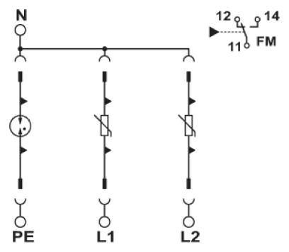 Вставной разрядник для защиты от перенапряжений, тип 2 / класс II, 2-фазных сетей электропитания с проводниками N и PE (4-проводные системы: L1, L2, N, PE), с контактом удаленного оповещения.