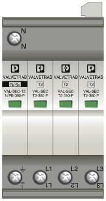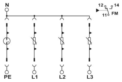 Вставной разрядник для защиты от перенапряжений, тип 2 / класс II, 3-фазных сетей электропитания с проводниками N и PE (5-проводные системы: L1, L2, L3, N, PE), с контактом удаленного оповещения.