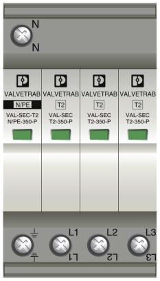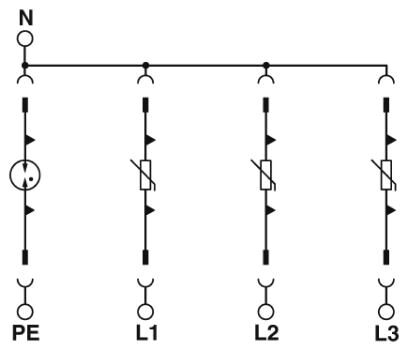 Вставной разрядник для защиты от перенапряжений, тип 2 / класс II, для 3-фазных цепей электропитания с раздельными проводниками N и PE (5-проводные системы: L1, L2, L3, N, PE).