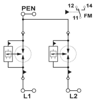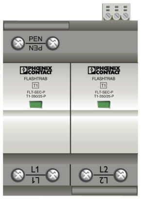 Вставной грозозащитный разрядник, соотв. типу 1 / класс I, для 2-фазных сетей электропитания с совмещенными проводниками PE и N (L1, L2, PEN).