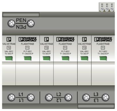 Вставной комбинированный разрядник для защиты от грозовых и импульсных перенапряжений, соотв. типу 1+2 / класс I+II, для 3-фазных сетей электропитания, с совмещенными проводниками N и PE (L1, L2, L3, PEN).