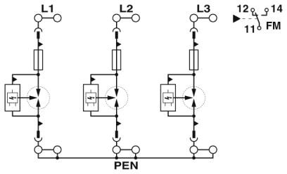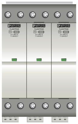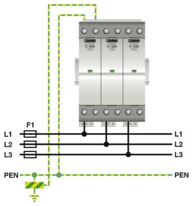 Вставной грозозащитный разрядник, тип 1 / класс I, с устойчивым к импульсным токам предохранителем, для 3-фазных электросетей с совмещенными проводниками PE и N (L1, L2, L3, PEN).
