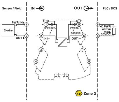 Одноканальный разделитель питания от выходного контура для развязки 2 цепей со штекерными разъемами для гальванической развязки и фильтрации аналоговых сигналов. Разделительный усилитель с питанием от выходных петель обеспечивает возможность работы на активной аналоговой входной карте при питании 6 В ... 30 В пост. тока. Подача питания на разделительный усилитель и датчики осуществляется через токовую петлю устройства управления. Входной сигнал = выходной сигнал: 0(4) мА ... 20 мА. Измерительный преобразователь обеспечивает возможность обмена данными NFC.