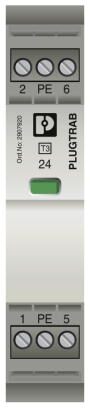 УЗИП типа 3, в комплектации из защитного штекера и базового элемента, со встроенным индикатором состояния и датчиком удаленного оповещения для однофазных электрических сетей. Номинальное напряжение 24 В AC/DC.