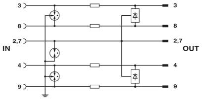 Промежуточный штекер D-SUB-9 с защитой от импульсных перенапряжений для интерфейсов RS-485. Возможность защелкивания на несущей рейке.