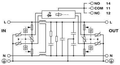 Устройство защиты приборов, согласно типу 3/класс III, с фильтром подавления ВЧ-напряжений помех, для 1-фазн. сетей питания с отдельными проводами N и PE (3-пров. система: L1, N, PE), с контактом дистанционной сигнализации.