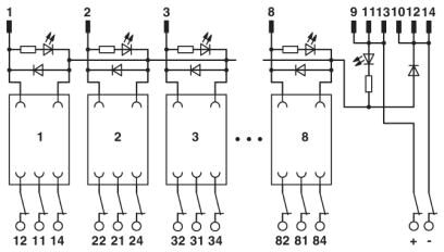 Модуль вывода VARIOFACE, со штекерными колодками для 8 миниатюрных реле, по 1 переключающему контакту, для цепей 24 В постоянного тока, с клеммами с ножевыми размыкателями на выходе (без реле)
