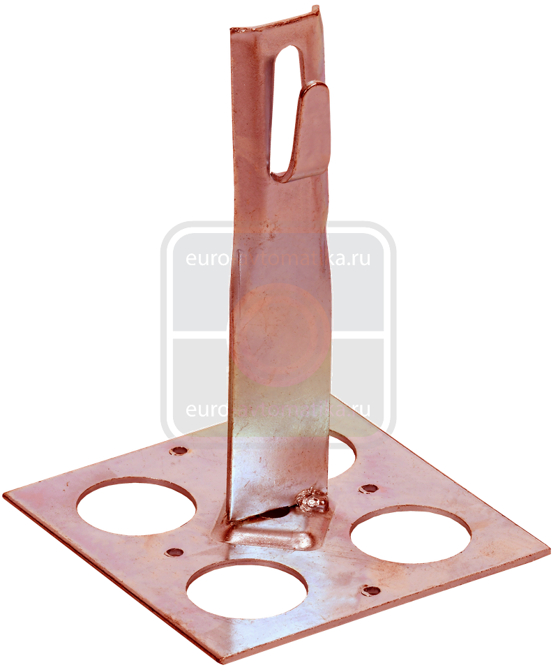 Держатель проводника круглого для плоской кровли с болтовым зажимом предназначен для закрепления прутка на плоской или наклонной кровле. Держатель крепится к кровле при помощи клея. Зажим проводника происходит путем загибания «язычка» держателя. Материал корпуса - медь.