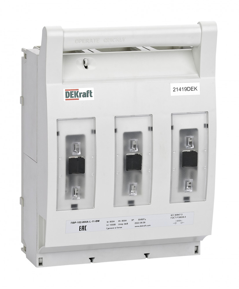 Dekraft 21419DEK ПВР горизонтальный 800А 3ф отключение_1НО+1НЗ_навесной монтаж на шину_ПВР-102 (21419DEK): цена, характеристики, отзывы, фото, инструкция - купить Рубильники (выключатель нагрузки) под плавкие предохранители 21419DEK в Москве оптом