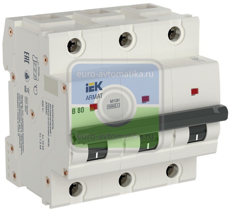 Автоматические выключатели ARMAT серии M10H предназначены для защиты цепей от перегрузки и короткого замыкания. Модельный ряд включает в себя устройства с характеристиками срабатывания B, C, D и Z, L, K на номинальные токи 80 и 100 А с числом полюсов от 1Р до 4Р. Номинальная наибольшая отключающая способность автоматических выключателей ARMAT серии M10H составляет 10 кА. Автоматические выключатели ARMAT серии M10H соответствуют ГОСТ IEC 60947-2 и ГОСТ IEC 60898-1. Конструкцией автоматических выключателей ARMAT серии M10H обеспечивается двойной разрыв контактной системы и двойная дугогасительная камера с совокупным числом де-ионных пластин 24, это двукратно увеличивает падение напряжения на электрической дуге в момент коммутации, за счет чего достигается быстрое и эффективное дугогашение.