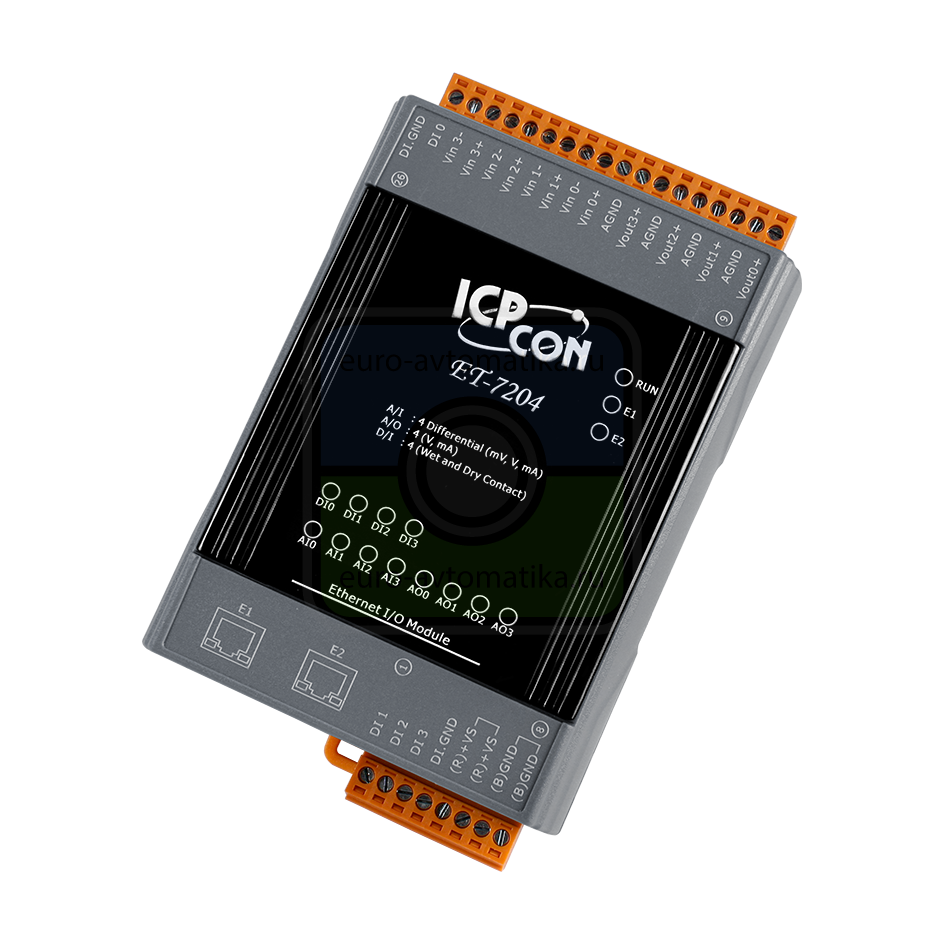 Ethernet-модуль с 4 каналами аналогового ввода, 4 каналами аналогового вывода и 4 каналами дискретного ввода, и со встроенным 2-портовым Ethernet-коммутатором
