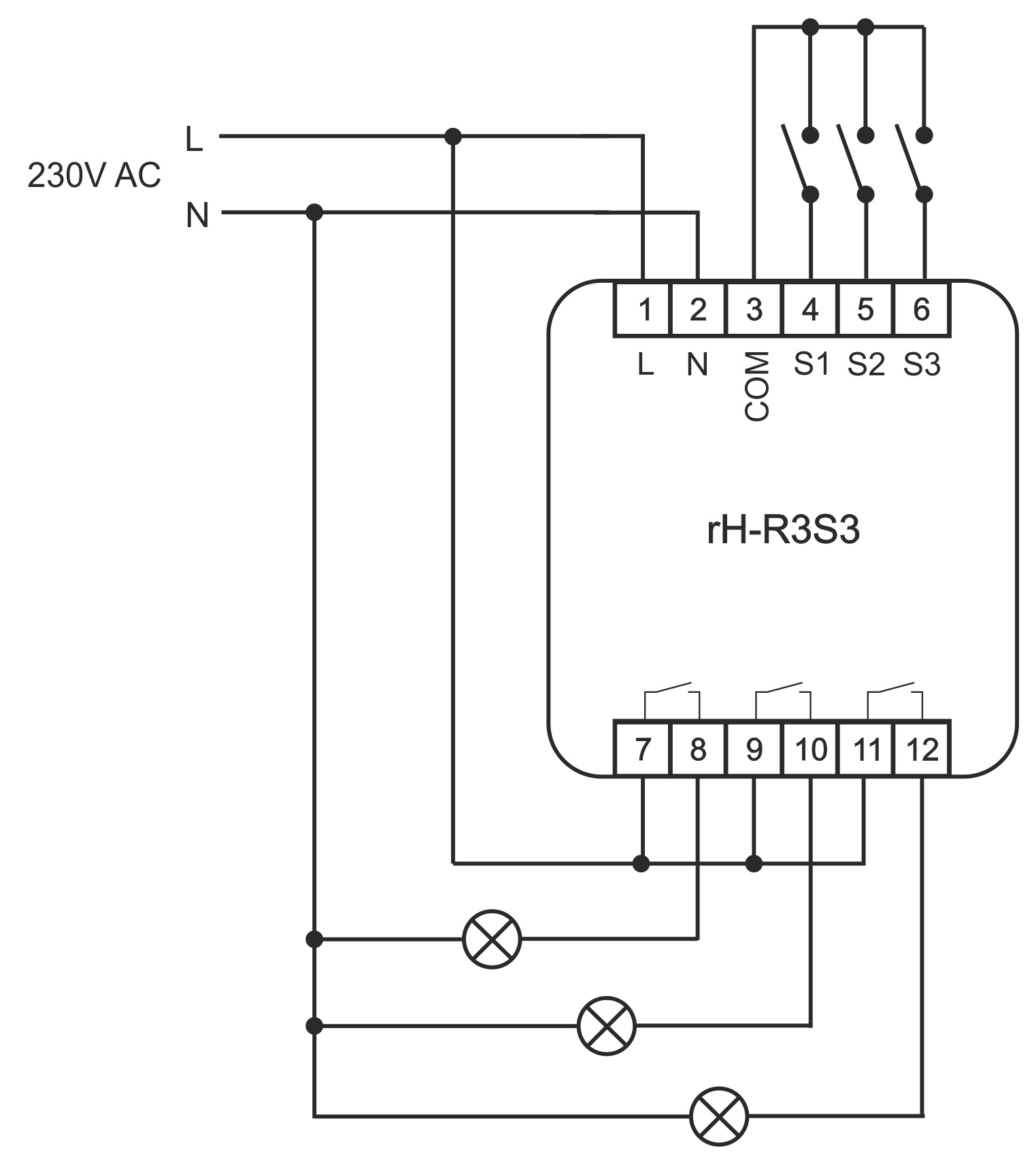 Принцип работыРеле rH-R3S3 получает (отправляет) информацию из (на) сервера о вкл./выкл. нагрузки и непосредственно управляет нагрузкой. Реле имеет три физических входа для подключения трех клавиш (выключателей без фиксации) и три выхода для подключения нагрузок. Нажатие клавиши, подключенной к контакту S1 и (или) S2, S3, включает или выключает соответствующую нагрузку. Описание работы и настроек режимов работы реле rH-R3S3 в Help конфигуратора.
