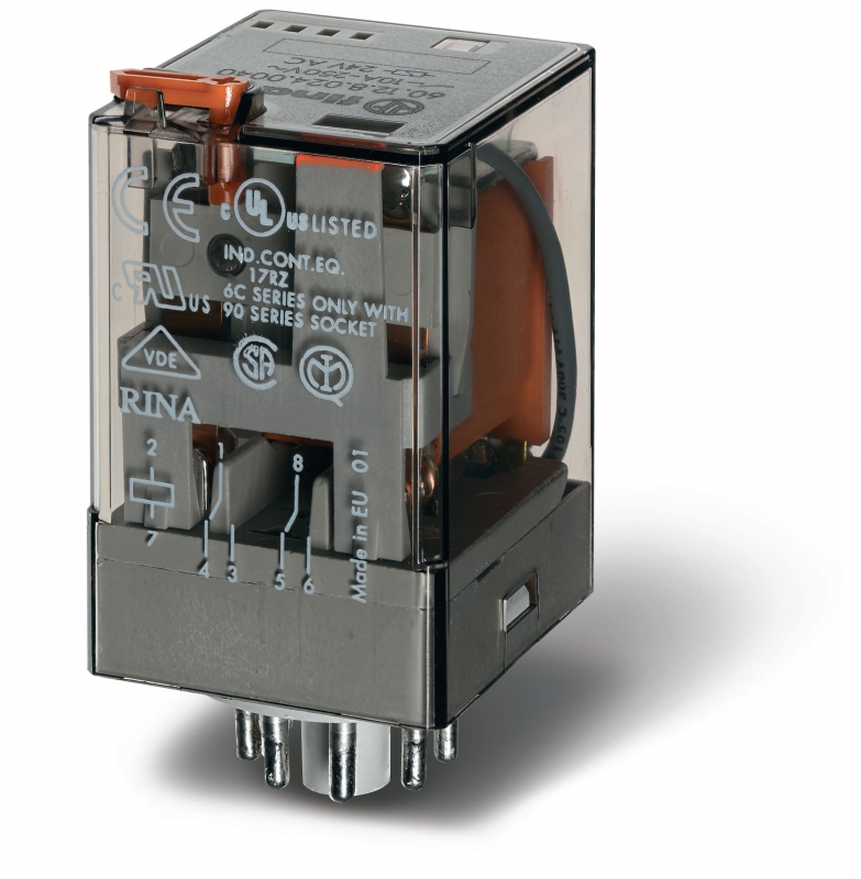 FINDER Универсальное электромеханическое реле; монтаж в розетку 8-штырьковый разъем; 2CO 10A; контакты AgNi; катушка 60В AC; степень защиты RTI; опции: кнопка тест + мех.индикатор(арт.601280600040) (601280600040): цена, характеристики, отзывы, фото, инструкция - купить Промежуточные реле 601280600040 в Москве оптом