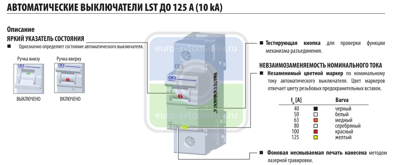 In 125 A, Ue 230/400 V a.c., 48 V d.c., характеристика D, 3+N-полюс, Icn 10 kA (для защиты проводок электрических цепей с оборудованием, которое вызывает высокие импульсы тока (трансформаторы, 2-полюсные двигатели и т.п.). Расцепитель короткого замыкания настроен на 12-16ln)