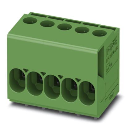 Клеммы для печатной платы, номинальный ток: 24 A, номинальное напряжение: 400 В, размер шага: 5,08 мм, полюсов: 5, тип подключения: Винтовой зажим с натяжной гильзой, монтаж: Пайка волной припоя, направление подключения, проводник/печатная плата: 0 °, цвет: зеленый