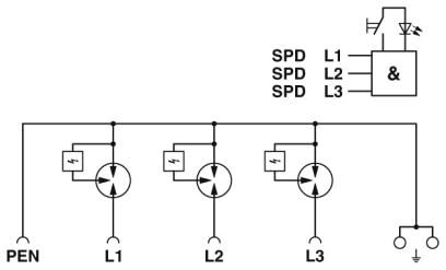 Молниезащитный разрядник, по типу 1 / классу I, для 3-фазных электросетей с совмещенными проводами N и PE (L1, L2, L3, PEN). Подходит для выравнивания потенциалов в системах без внешней молниезащиты с вводом питания от ЛЭП и без него. Для монтажа на системах сборных шин с расстоянием 40 мм.
