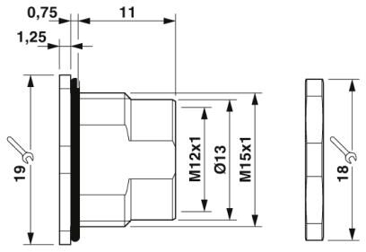 Крепежный резьбовой элемент корпуса, Гнездо, M12, Монтаж с внутренней стороны, M15 x 1