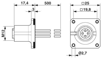 Встр. гнездо для датчика/исп. устр-ва, 17-конт., M12, с мех. ключом A, монтаж на передней панели/с помощью квадратных фланцев, с гибким проводом 0,5 м (TPE), 17 x 0,14 мм