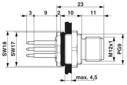 Встраиваемая штекерная часть разъема для датчика / исполнительного элемента, 5 контактов, M12-SPEEDCON, с механическим ключом А-типа, монтаж с задней части стенки / резьбовое крепление Pg9, с прямыми выводами под пайку, исполнение с выводами под пайку длиной 12 мм