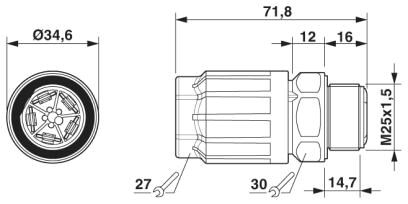 Проходная деталь, Тип подключения QUICKON, полюсов: 4+PE, 1 мм² ... 2,5 мм², 690 В, 20 A, черный, без гайки QUICKON, диапазон диаметра кабеля: 6 мм ... 10 мм, монтажная резьба: M25, отдельные жилы (приварен), 2,5 мм², жилы ровно обрезаны, длина кабеля: 0,5 м
