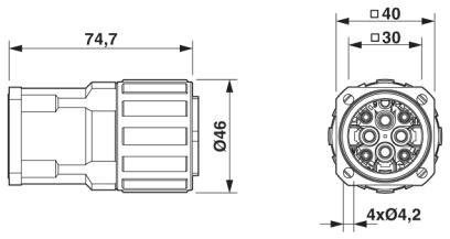 Приборный соединитель, передняя часть стенки, с накатанной гайкой, прямой, Винтовой зажим, M40, полюсов: 4+3+PE, тип контактов: Розетка, Обжим, Аксиальное уплотнительное кольцо, 4x Ø4,2, экранирован.: есть, размер фланца: 40 мм x 40 мм, диапазон диаметра кабеля: 0 мм ... 0 мм