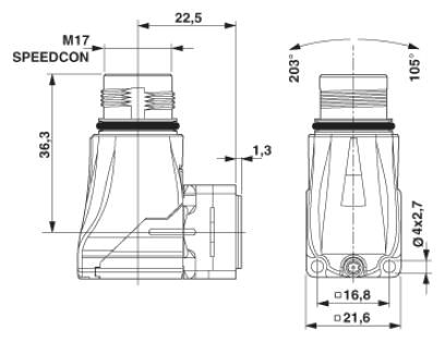Аппаратн. соединитель, передняя стенка, угловой, поворотный, Крепление SPEEDCON, M17, полюсов: 6+PE, тип контактов: Штифт, Обжим, Аксиальное уплотнительное кольцо, 4x Ø2,7, экранирован.: есть, размер фланца: 21,6 мм x 21,6 мм