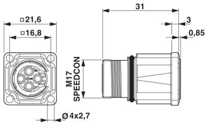 Аппаратн. соединитель, передняя стенка, прямой, для стандартной блокировки и SPEEDCON, M17, полюсов: 5+3+PE, тип контактов: Розетка, Обжим, экранирован.: есть, размер фланца: 21,6 мм x 21,6 мм