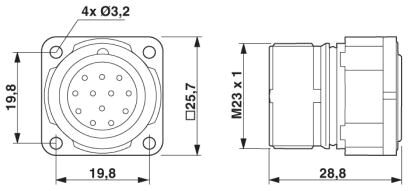 Аппаратн. соединитель, передняя стенка, прямой, Винтовой зажим, M23, полюсов: 12, тип контактов: Штифт, Подключение пайкой, Аксиальное уплотнительное кольцо, 4x Ø 3,2, экранирован.: есть