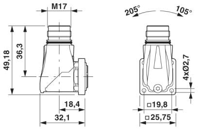 Аппаратн. соединитель, передняя стенка, угловой, поворотный, для стандартной блокировки и SPEEDCON, M17, полюсов: 5+PE, тип контактов: Штифт, Обжим, Аксиальное уплотнительное кольцо, 4x Ø2,7, экранирован.: есть, размер фланца: 25,75 мм x 25,75 мм