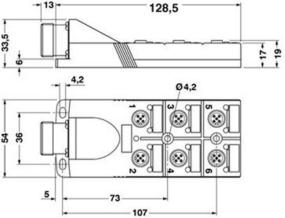 Коробка датчика и исполнительного элемента, применение: Стандартн., тип подключения: Розетка M12 Пластик, количество гнезд: 6, полюсов: 4, механические ключи: A - стандарт, гнездо для платы: oдин ряд, индикатор состояния: есть, p-n-p; годключение магистрального кабеля: Штекерный разъем M 23 180°, экранировка: нет