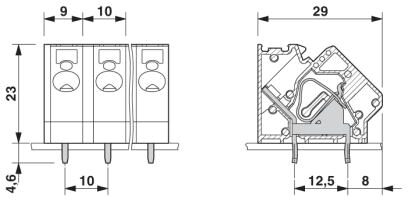 Клеммы для печатной платы, номинальный ток: 32 A, номинальное напряжение: 630 В, размер шага: 10 мм, полюсов: 12, тип подключения: Пружинный зажим, монтаж: Пайка волной припоя, направление подключения, проводник/печатная плата: 45 °, цвет: зеленый