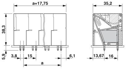 Клеммы для печатной платы, номинальный ток: 125 A, номинальное напряжение: 1000 В, размер шага: 15 мм, полюсов: 2, тип подключения: Пружинные зажимы Push-in, монтаж: Пайка волной припоя, направление подключения, проводник/печатная плата: 90 °, цвет: зеленый